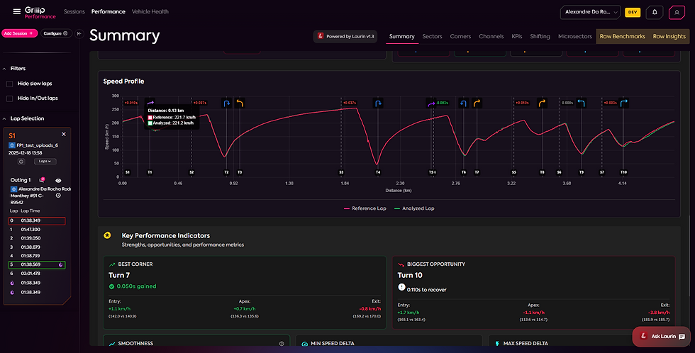 Every session benefits from AI-generated Reference Lap Reports, automatically created for each vehicle to highlight where time was lost and how to gain it back.